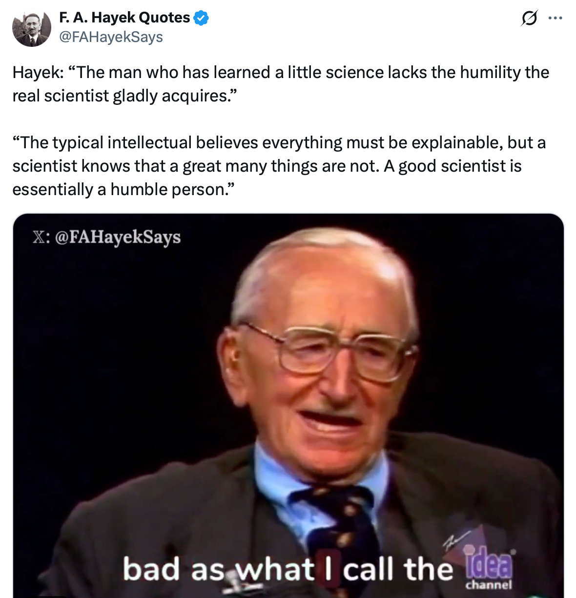 None of this is good for American society. Our scientists should follow in Hayek’s footsteps and admit they DON’T truly have all the answers.