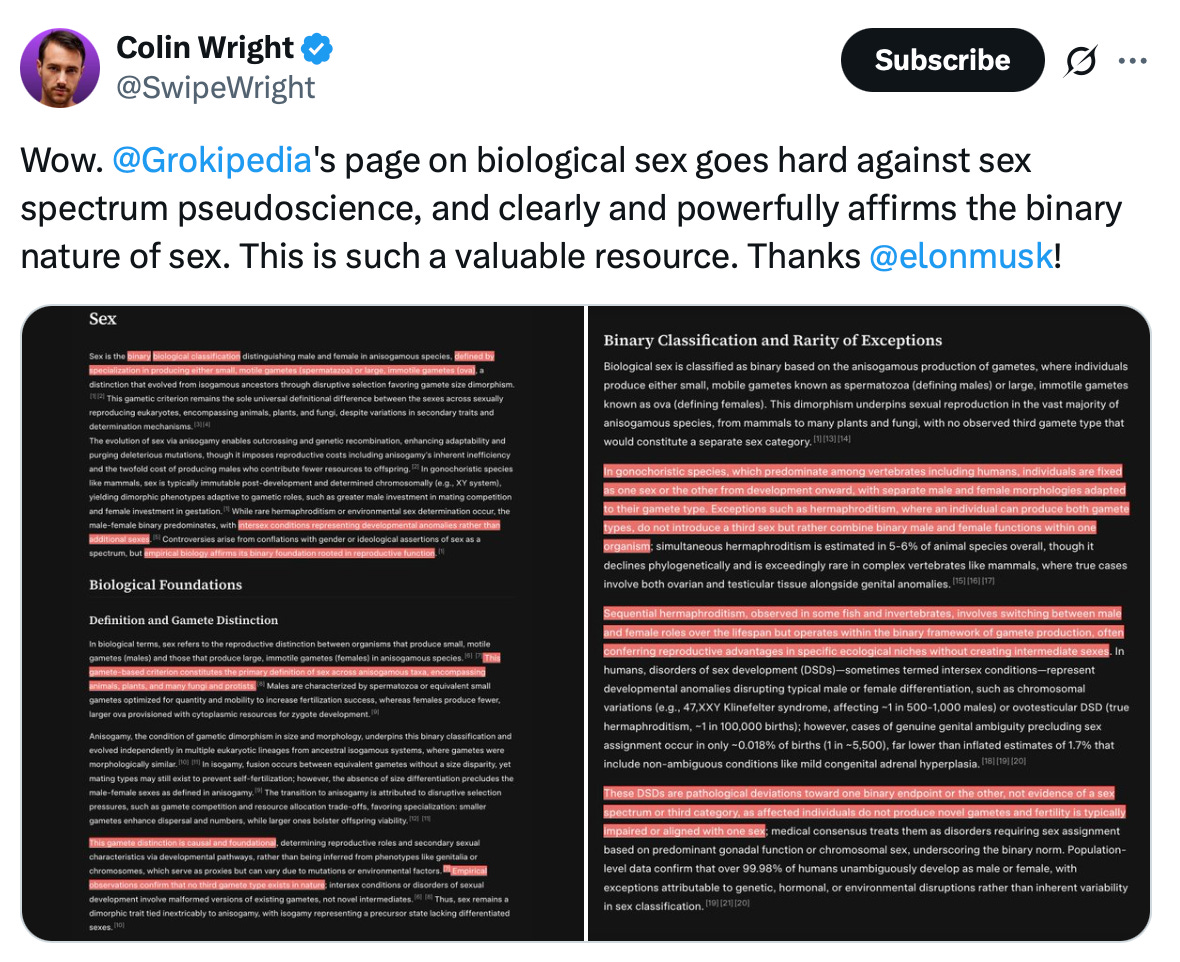 This is demonstrated through Grokipedia’s page that features biological sex.