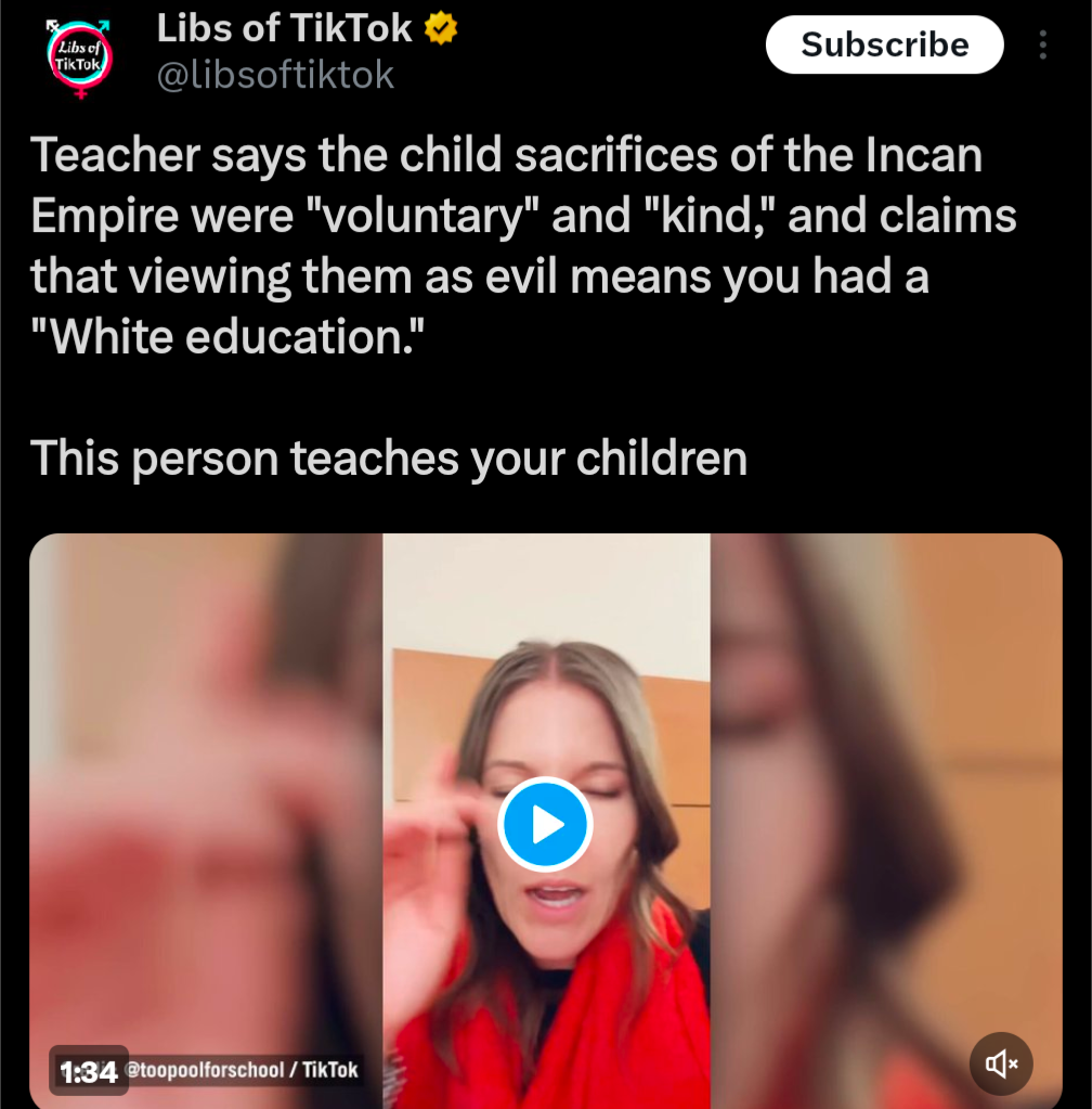 Playback speed×Share postShare post at current timeShare from 0:000:00/0:00462315INSANE Teacher Says Incan Child Sacrifices Were No BiggieAug 31, 2025462315ShareTeacher says the child sacrifices of the Incan Empire were "voluntary" and "kind," and claims that viewing them as evil means you had a "White education."This person teaches your childrenDiscussion about this videoCommentsRestacksDeskooledSubscribeRecent PostsTeacher plans to sue after being fired for criticizing school policy allowing males in girl's sportsOct 12Whiteness Test A Requirement for Teachers in MichiganOct 8LIFE IN PRISON for these doctors that hurt kidsOct 4Psycho Anti-Semitic College Prof is a Huge Fan of MaoSep 26CHLOE COLE: The mutilators and liars will not go down without a fight! Sep 20Parents Know Their Kids Better Than Useless BureaucratsSep 14Randi Weingarten CRIES About Trump Passing School Choice! Aug 27
