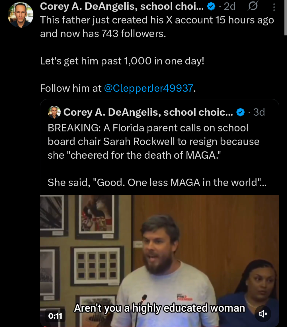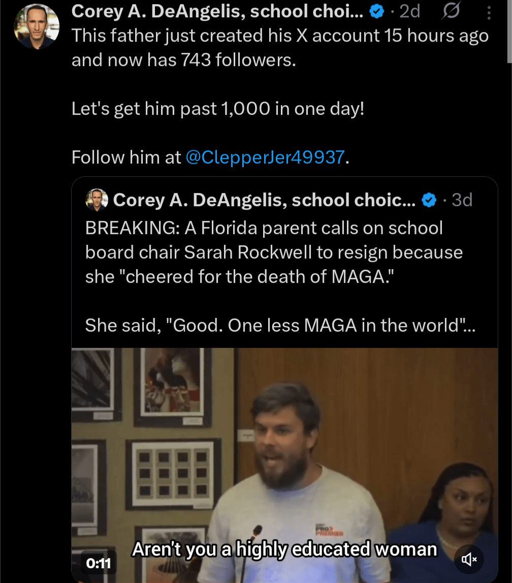 Playback speed×Share postShare post at current timeShare from 0:000:00/0:005259Nasty School Board Chair Cheered "for the Death of MAGA" Aug 13, 20255259ShareBREAKING: A Florida parent calls on school board chair Sarah Rockwell to resign because she "cheered for the death of MAGA."She said, "Good. One less MAGA in the world" in response to Hulk Hogan’s death.Discussion about this videoCommentsRestacksDeskooledThe latest on woke politics and our failing education system. The latest on woke politics and our failing education system. SubscribeListen onSubstack AppSpotifyPocket CastsRSS FeedRecent EpisodesAnother public school teacher attacks an innocent personOct 7Democrat policies created HUGE child trafficking ringsOct 6Seattle Children's Hospital is providing DISGUSTING materials to public schoolsOct 5This just proves how deep the Public School INDOCTRINATION system really goesSep 18BREAKING: FEMA SECTION CHIEF Claims Charlie Kirk "Kind of Deserved It"Sep 16The OFFICIAL BLM account says it has a RIGHT TO VIOLENCESep 15RON PAUL Curriculum: A Homeschool Curriculum Like No OtherMar 27