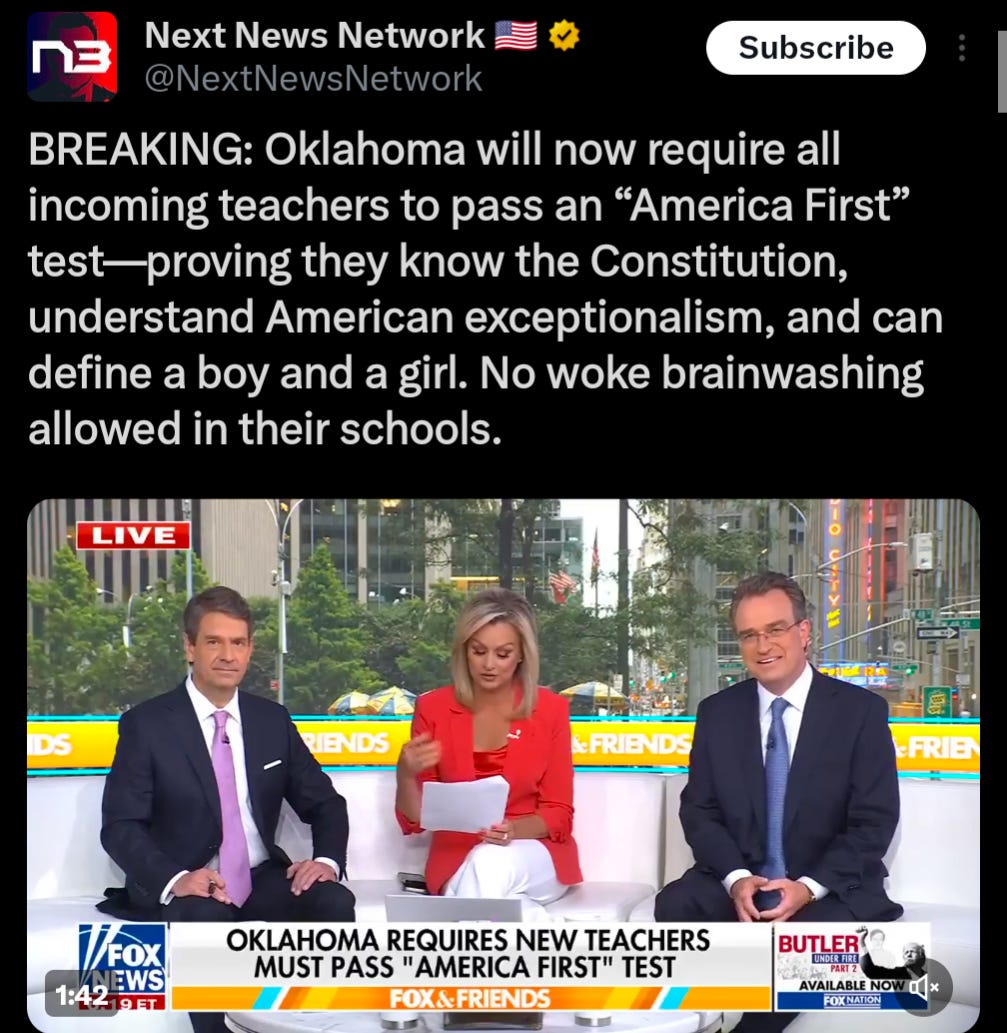 BREAKING: Oklahoma will now require all incoming teachers to pass an “America First” test—proving they know the Constitution, understand American exceptionalism, and can define a boy and a girl. No woke brainwashing allowed in their schools.