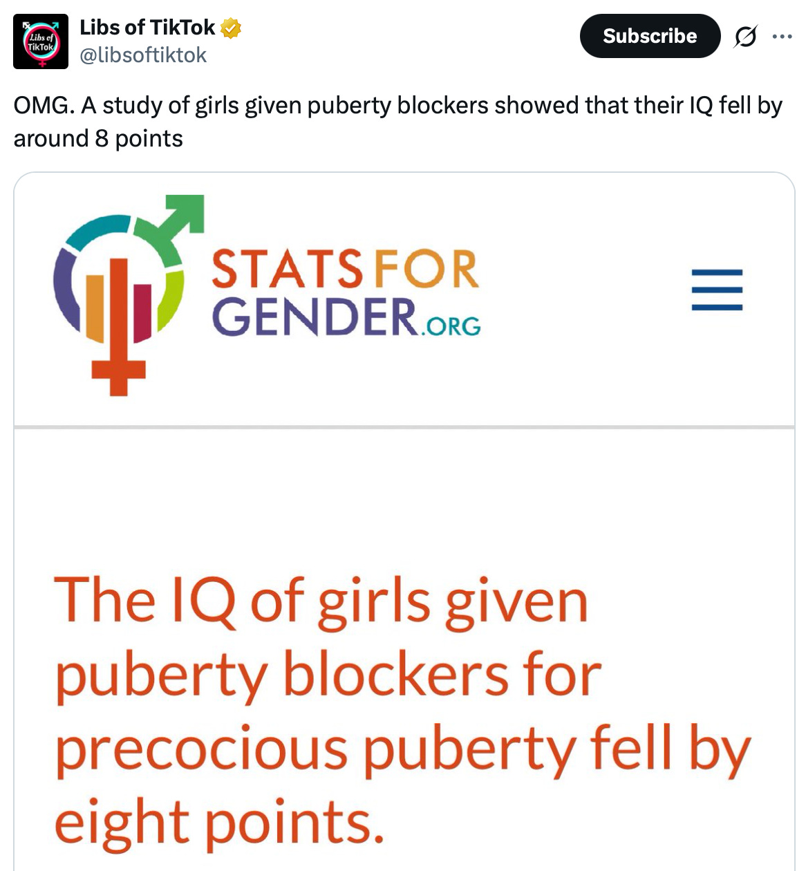 According to a Dutch study tracking 15 girls who received puberty blockers, their collective IQ average dropped from 102 to 94.