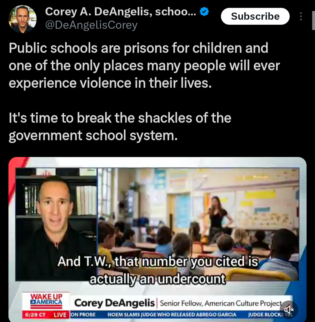 Playback speed×Share postShare post at current timeShare from 0:000:00/0:0051525Public Schools are Prisons for ChildrenHomeschool your kidsNov 29, 202551525SharePublic schools are prisons for children and one of the only places many people will ever experience violence in their lives.It's time to break the shackles of the government school system.Deskooled is a reader-supported publication. To receive new posts and support my work, consider becoming a free or paid subscriber.SubscribeDiscussion about this videoCommentsRestacksDeskooledSubscribeRecent PostsUndercover journalists CAUGHT school administrators telling a parent how she could get her boy into girls' sportsNov 19Texas A&M student kicked out of class for objecting to TRANS lessonNov 9The Public School model was created to force obedienceOct 30University textbook claims all Christians are white supremacistsOct 20Teacher plans to sue after being fired for criticizing school policy allowing males in girl's sportsOct 12Whiteness Test A Requirement for Teachers in MichiganOct 8LIFE IN PRISON for these doctors that hurt kidsOct 4