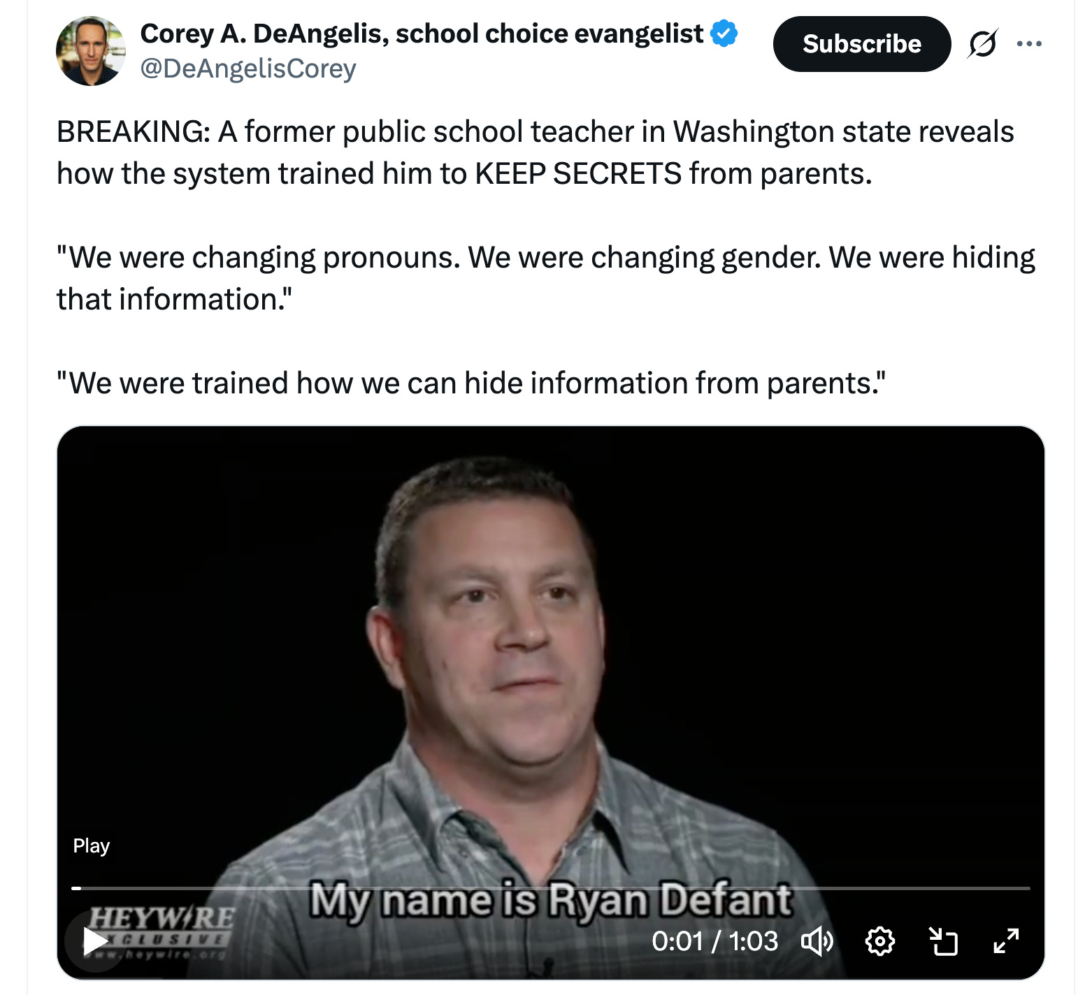 Ryan Defant, a public school teacher in Washington, has revealed that his school and many others keep secrets from parents so that they can groom your kids.