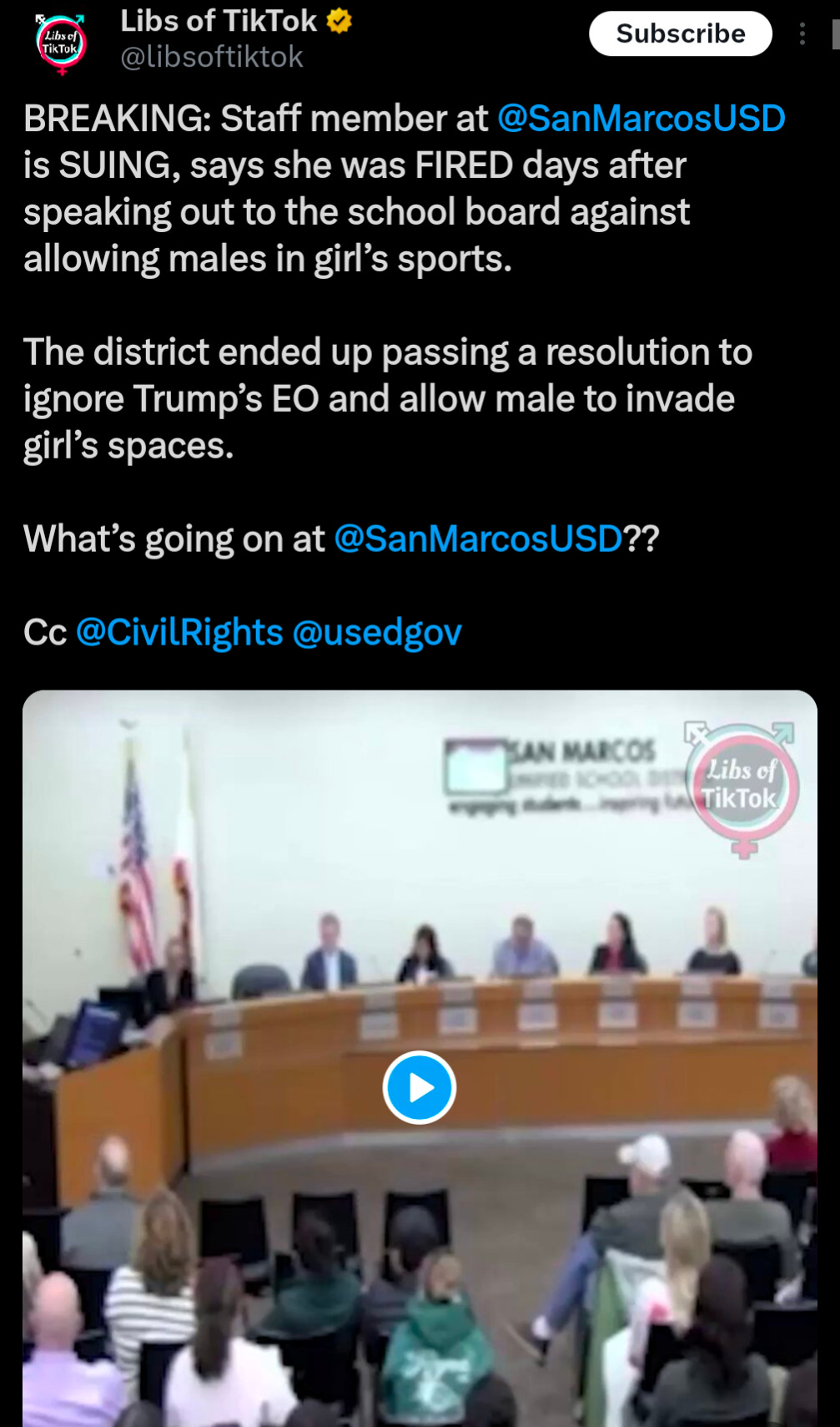 BREAKING: Staff member at SanMarcosUSD is SUING, says she was FIRED days after speaking out to the school board against allowing males in girl’s sports.