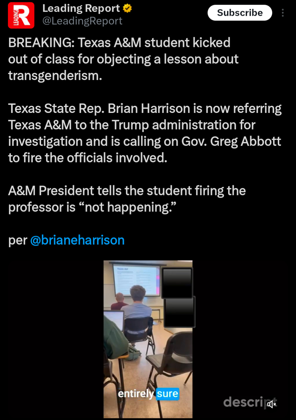 BREAKING: Texas A&M student kicked out of class for objecting a lesson about transgenderism.