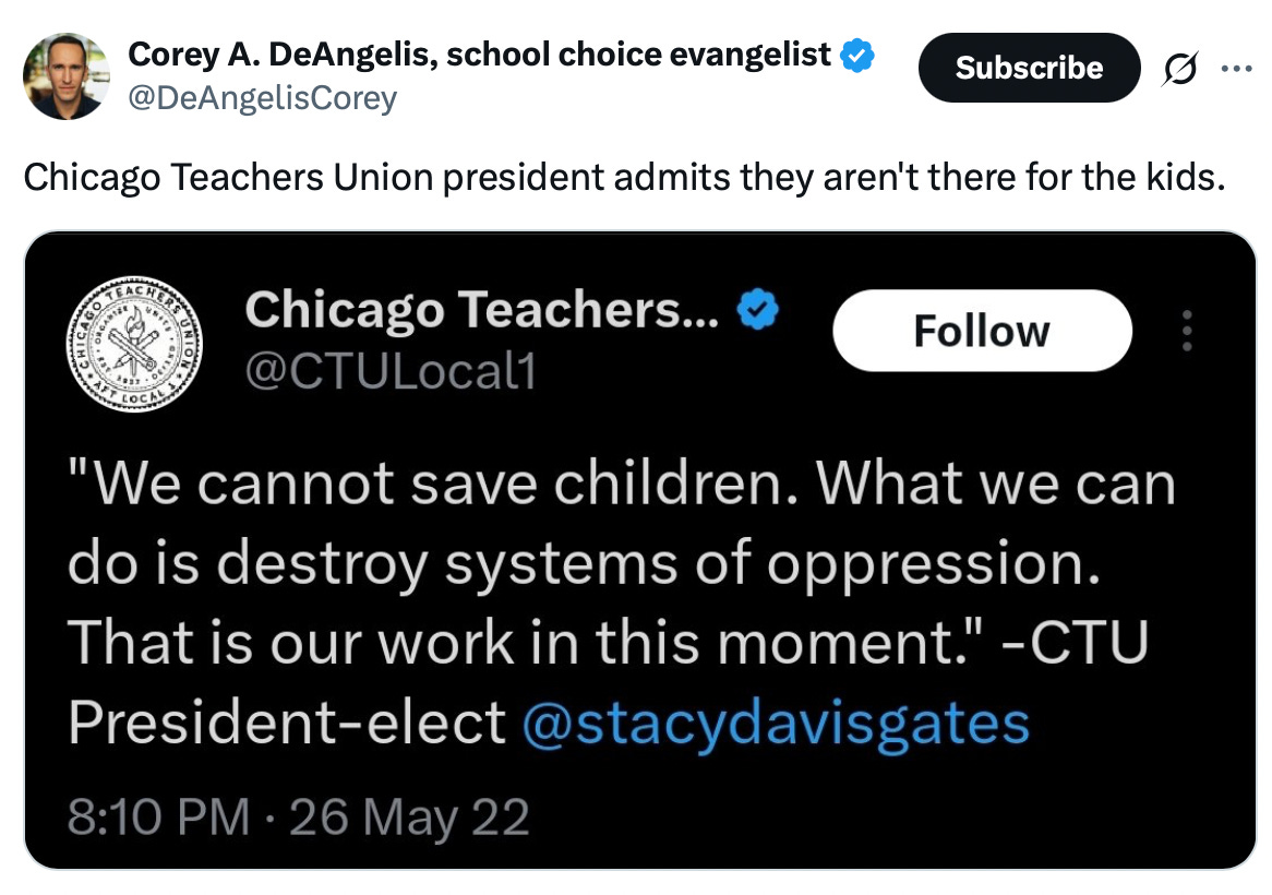 In black and white, the group declared that it “cannot save children.” Instead, the Chicago Teachers Union stated its “work in the moment” is to “destroy systems of oppression.”