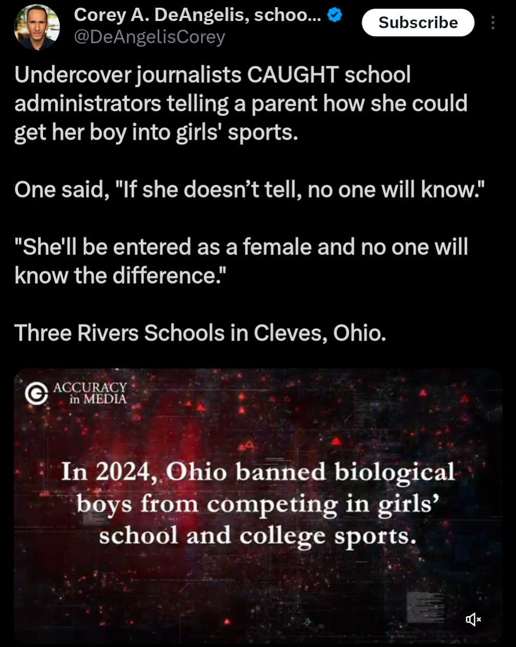Playback speed×Share postShare post at current timeShare from 0:000:00/0:002225Undercover journalists CAUGHT school administrators telling a parent how she could get her boy into girls' sportsNov 19, 20252225ShareOne said, "If she doesn’t tell, no one will know.""She'll be entered as a female and no one will know the difference."Three Rivers Schools in Cleves, Ohio.Deskooled is a reader-supported publication. To receive new posts and support my work, consider becoming a free or paid subscriber.SubscribeDiscussion about this videoCommentsRestacksDeskooledSubscribeRecent PostsTexas A&M student kicked out of class for objecting to TRANS lessonNov 9The Public School model was created to force obedienceOct 30University textbook claims all Christians are white supremacistsOct 20Teacher plans to sue after being fired for criticizing school policy allowing males in girl's sportsOct 12Whiteness Test A Requirement for Teachers in MichiganOct 8LIFE IN PRISON for these doctors that hurt kidsOct 4Psycho Anti-Semitic College Prof is a Huge Fan of MaoSep 26