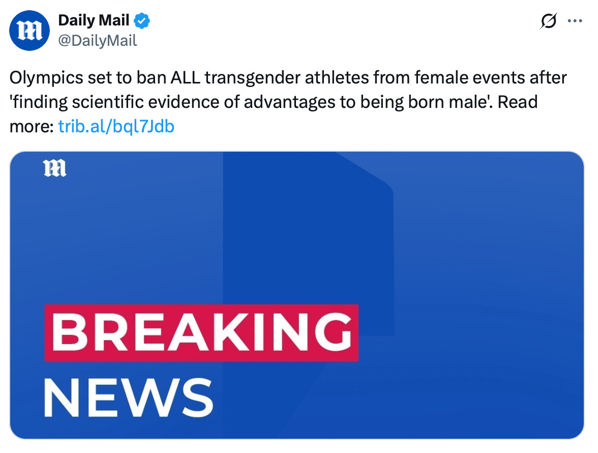 In real time, there are already ongoing efforts to make the Olympics walk back their incoming ban on males playing in women’s sports.